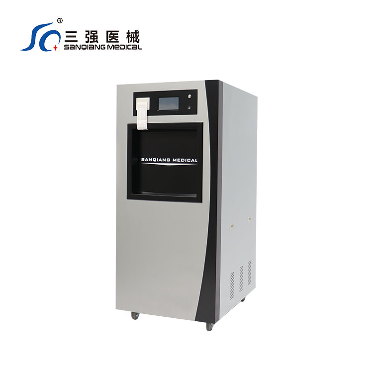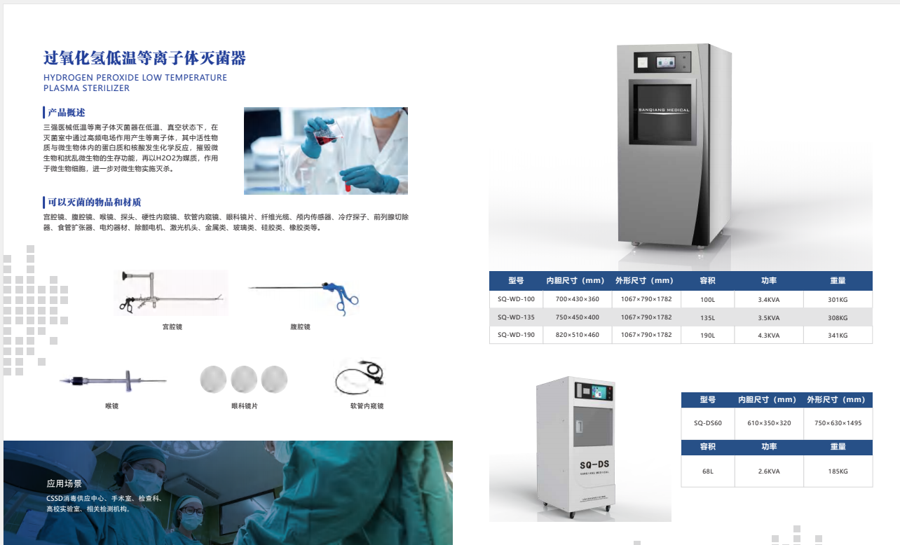低温等离子过氧化氢器 河南三强医用快速消毒 消毒供应中心整体配套方案 过氧化氢低温等离子体器 总体概述 三强牌低温等离子过氧化氢器在低温、真空状态下,在室中通过高频电场作用产生等离子体,其中活性物质与微生物体内的蛋白质和核酸发生化学反应,摧毁微生物和扰乱微生物的生存功能,再以H₂O₂为媒质,作用于微生物细胞,进一步对微生物实施灭杀。 一、产品基本信息 1. 简要 ◆ 产品名称:过氧化氢低温等离子体器 ◆ 产品型号:SQ-WD-100 ◆ 器械类别:Ⅱ类注册 ◆ 生产厂家:河南省三强医疗器械有限责任公司 2. 尺寸 ◆ 外形尺寸:(长×宽×高)1067×790×1782mm ◆ 室尺寸:(长×宽×高)700×430×360mm ◆ 总容积:不小于 100L ◆ 有效容积:不小于 80L 3. 关键使用信息 ◆ 过氧化氢浓度:58%~60% ◆ 药剂规格:9g/支 ◆ 工作温度:45℃~60℃ ◆ 时间:快速≤35min;加强≤55min;管腔≤60min ◆ 能耗:≤2.4 度电/每锅次 4. 使用环境 ◆ 电源:AC(220±22)V;(50±1)Hz ◆ 功率:3.4kVA ◆ 重量:301kg ◆ 环境温度:10~40℃ ◆ 相对湿度:不大于 80% ◆ 大气压力范围:70kpa~106kpa